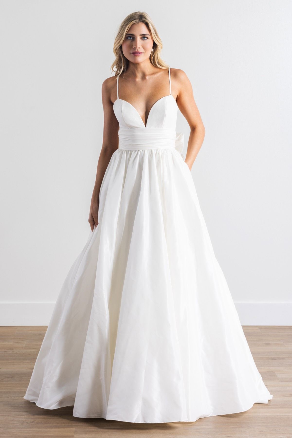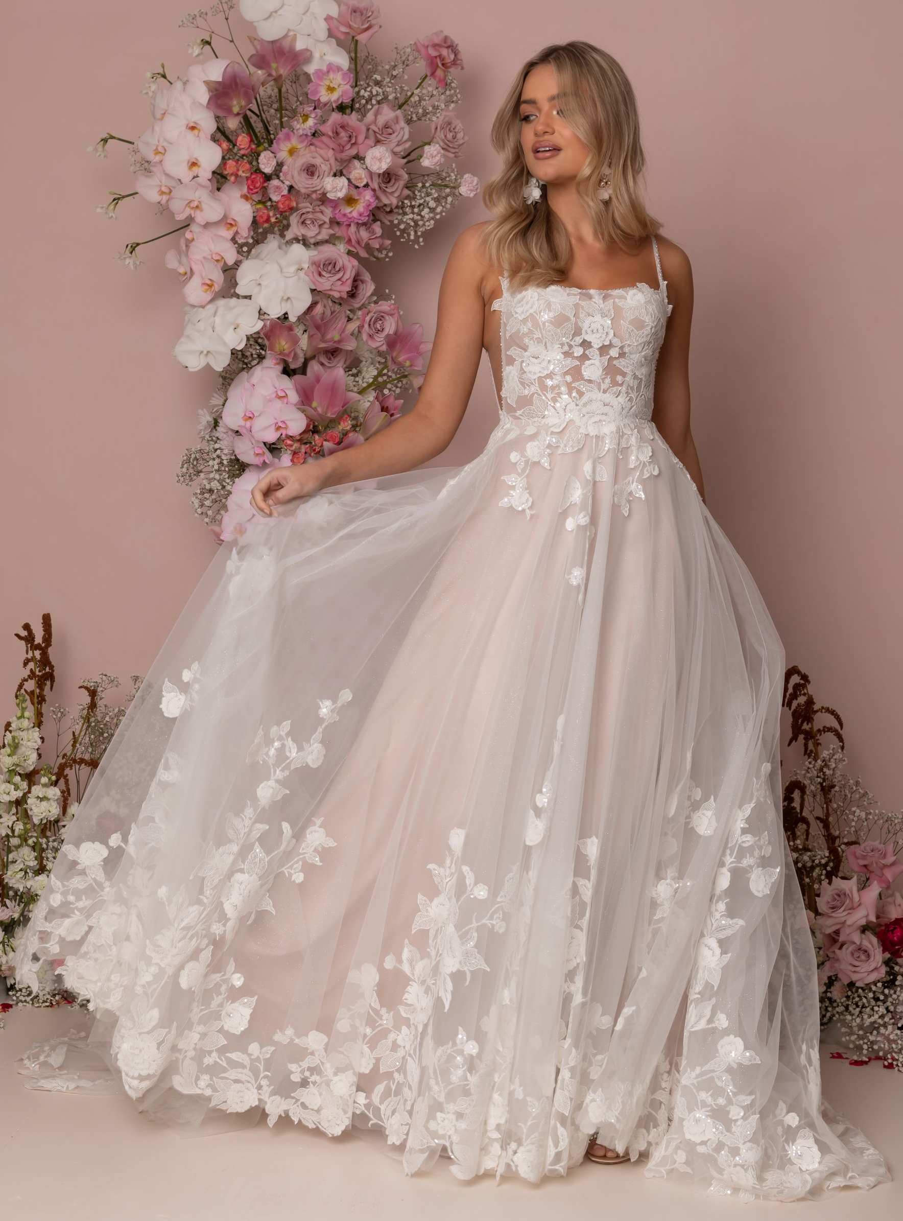 Ein Kleid im Stil New Romance mit fließender A-Linie, V-Ausschnitt, zarten Trägern, tiefem Rücken und edlem Materialmix aus Chiffon und Spitze.