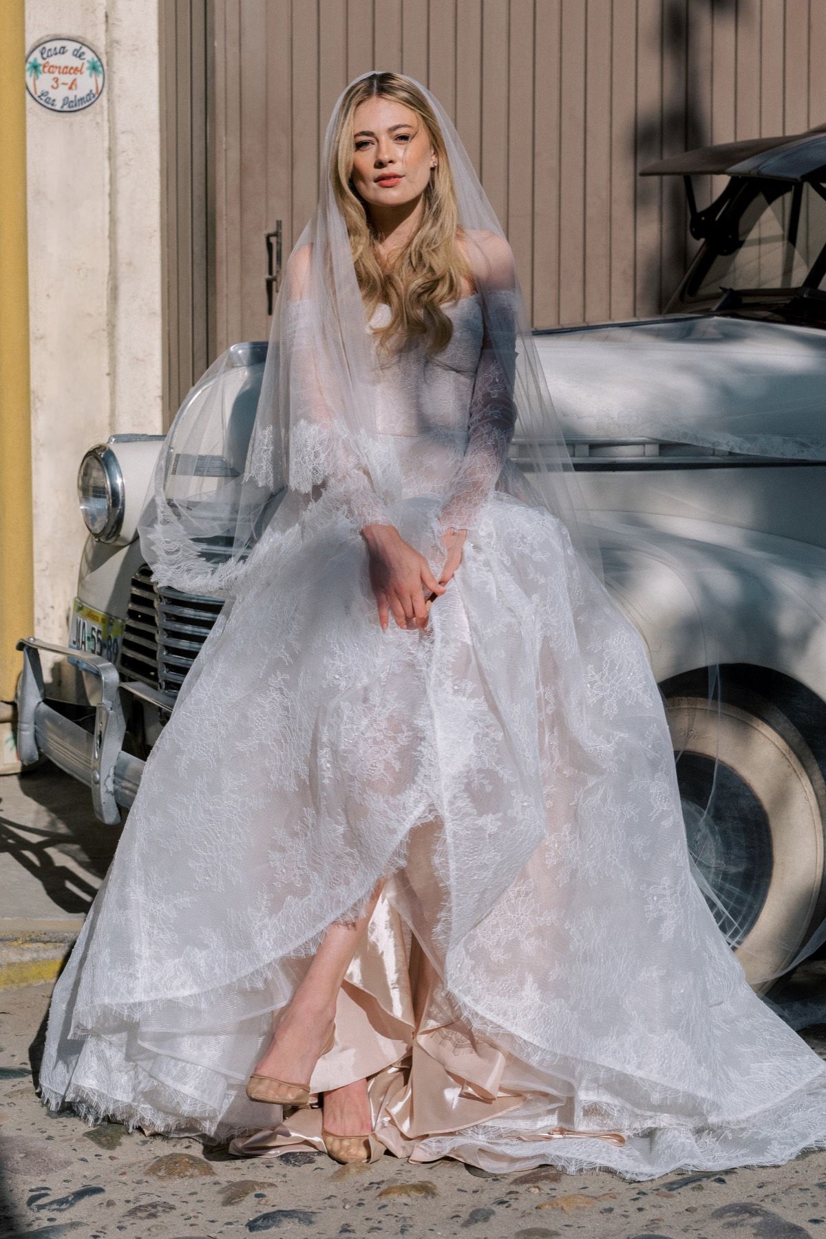 Glitzerndes Fit-and-Flare-Kleid mit drapierter Corsage, Off-Shoulder-Trägern und abnehmbarem Overskirt – luxuriös, figurbetont und perfekt für den Red-Carpet-Moment.